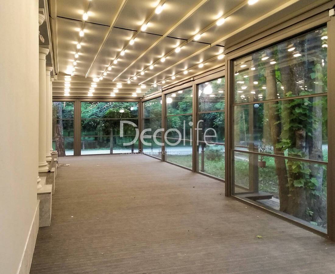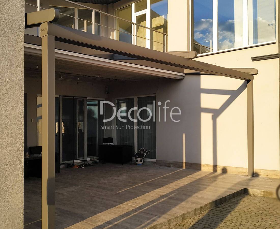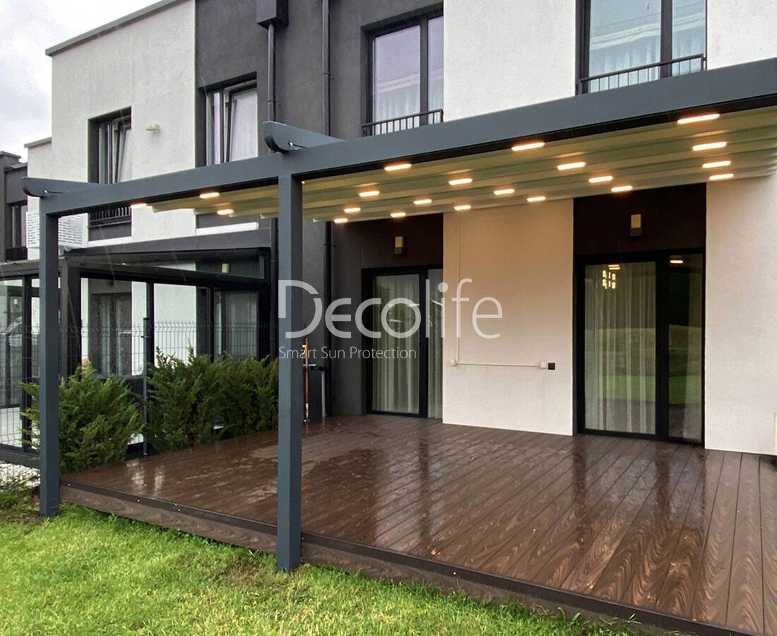 Пергола Decolife B600 PIR + Фасадные жалюзи FZ-44 + Гильотинное W500 и раздвижное S200 остекление - г. Минск