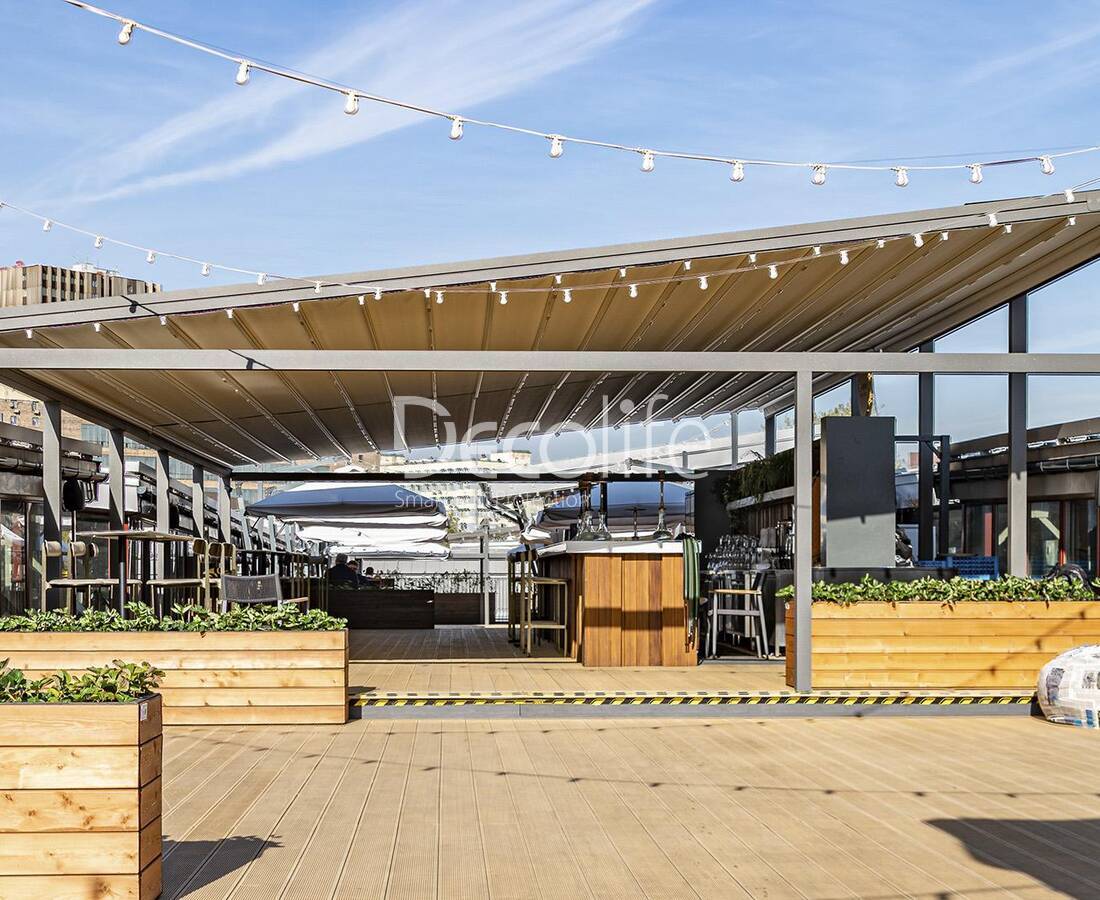 Но главная функция перголы – это затенение, защита от яркого солнца и жары. Материал крыши обладает текстурой, которая блокирует ультрафиолет и сохраняет циркуляцию воздуха, поэтому духоты под навесом не возникает. Смещение крыши происходит в автоматическом режиме, а за прочной всей системы отвечают надежные и долговечные алюминиевые элементы.